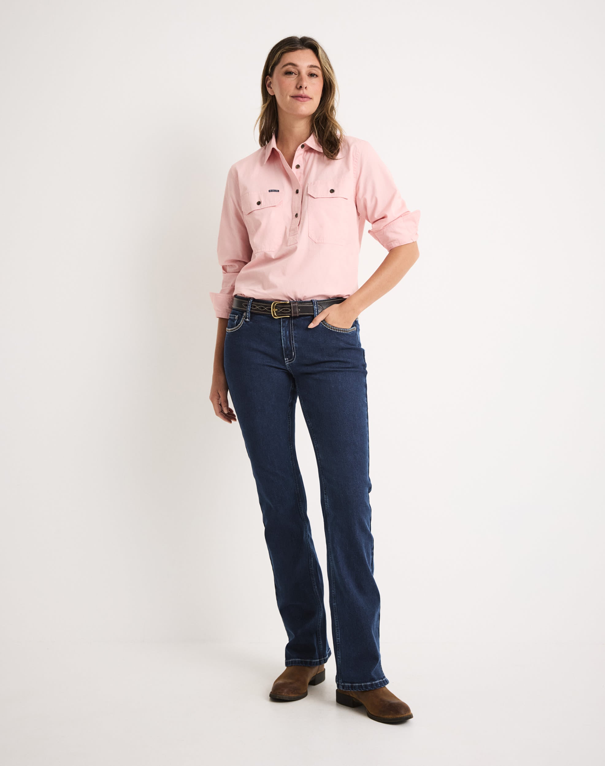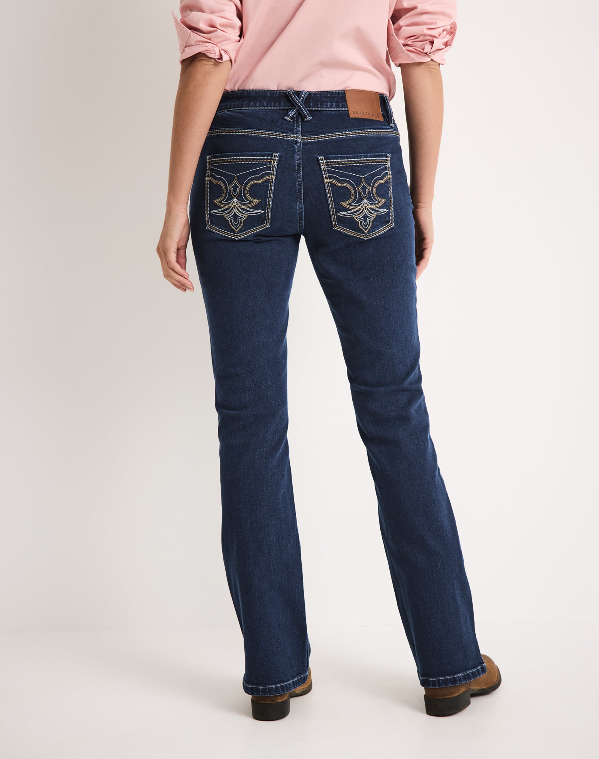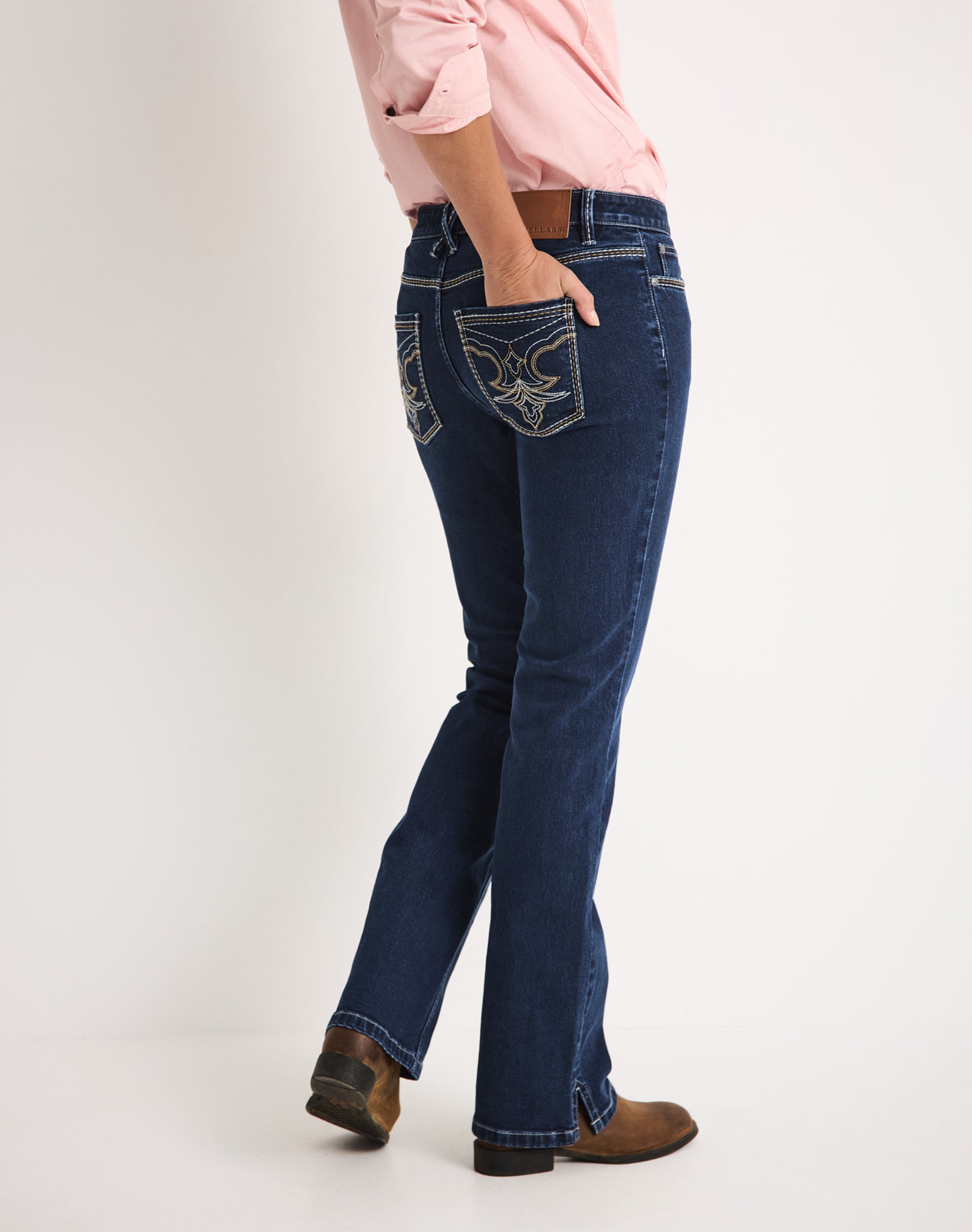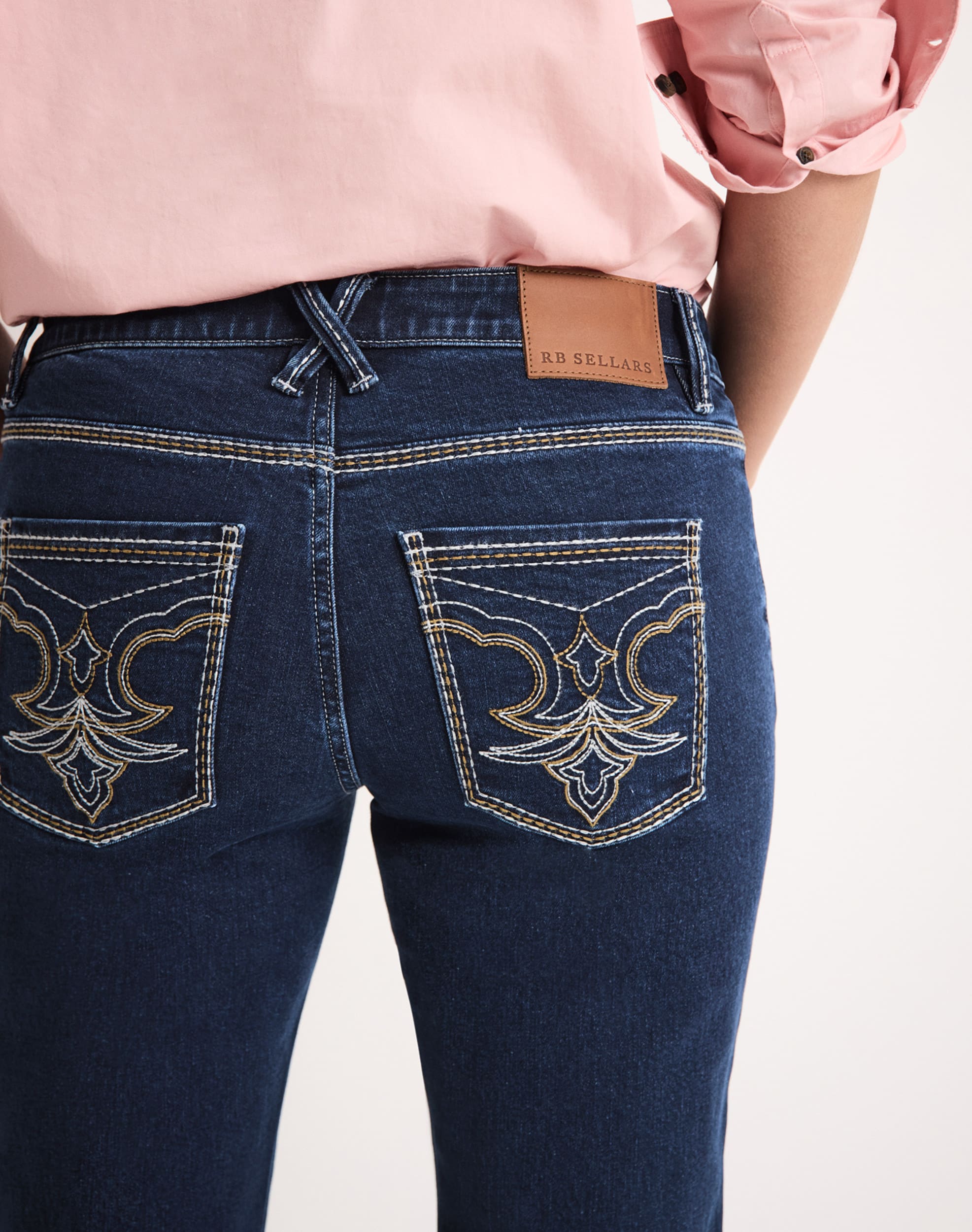 Western-inspired embroidery on back pockets with contrast stitching
