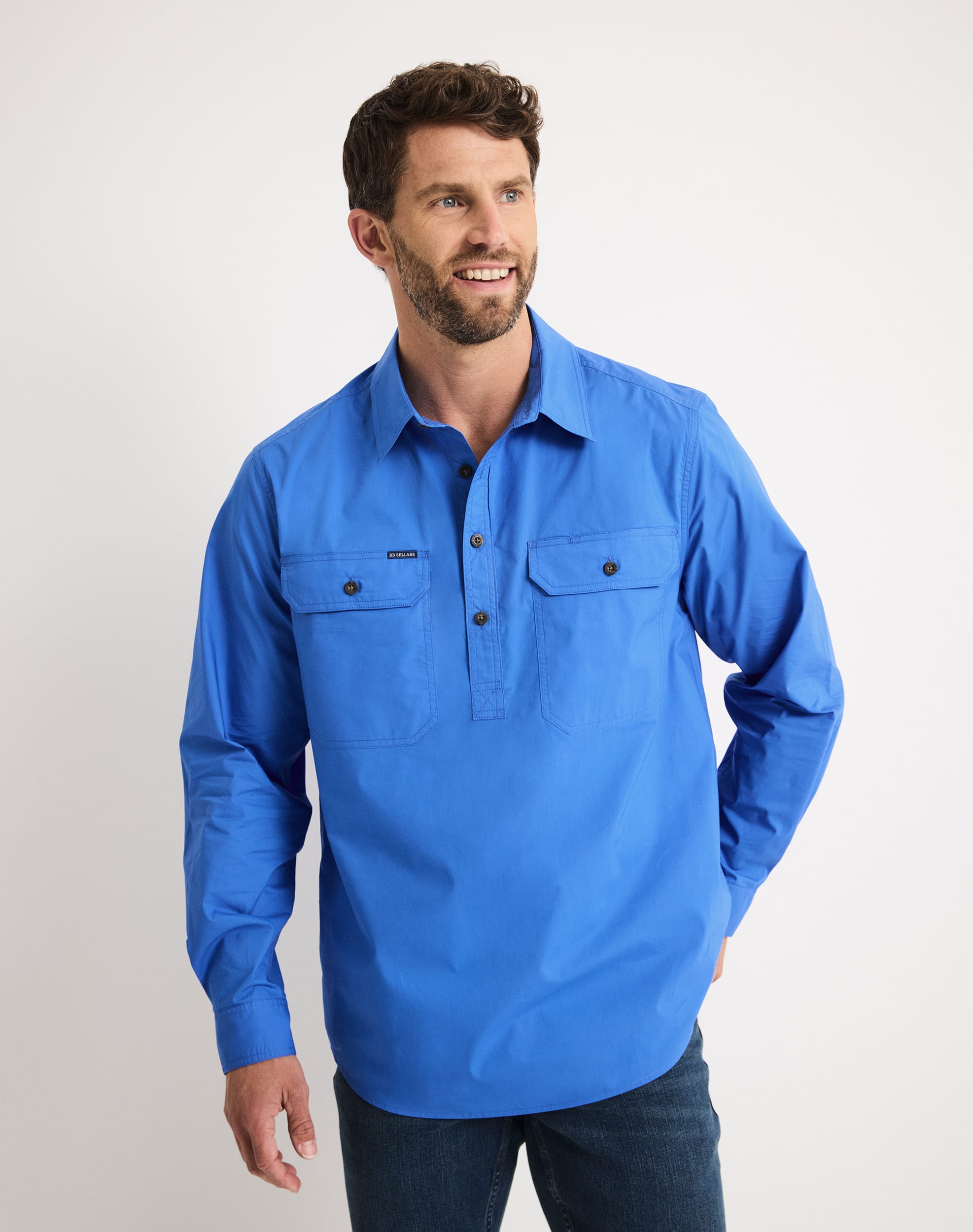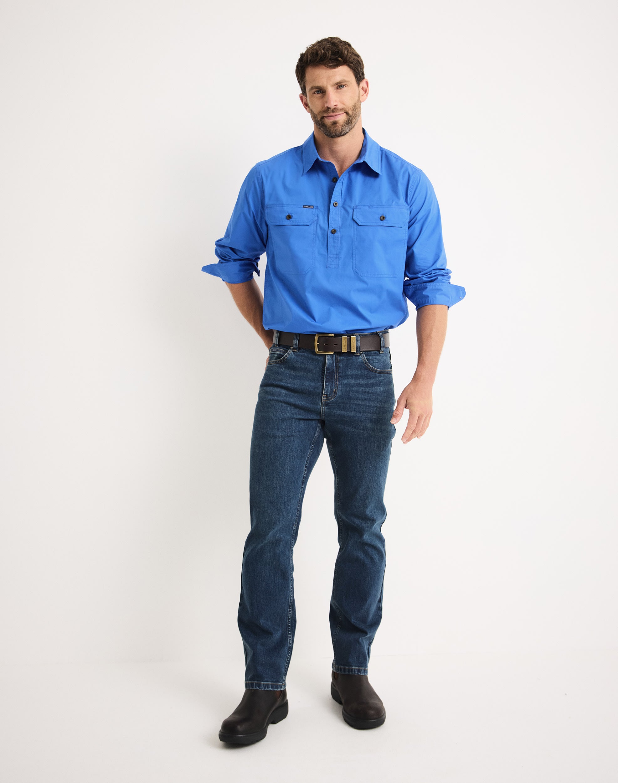 Two chest pockets with flap closures and pen slip