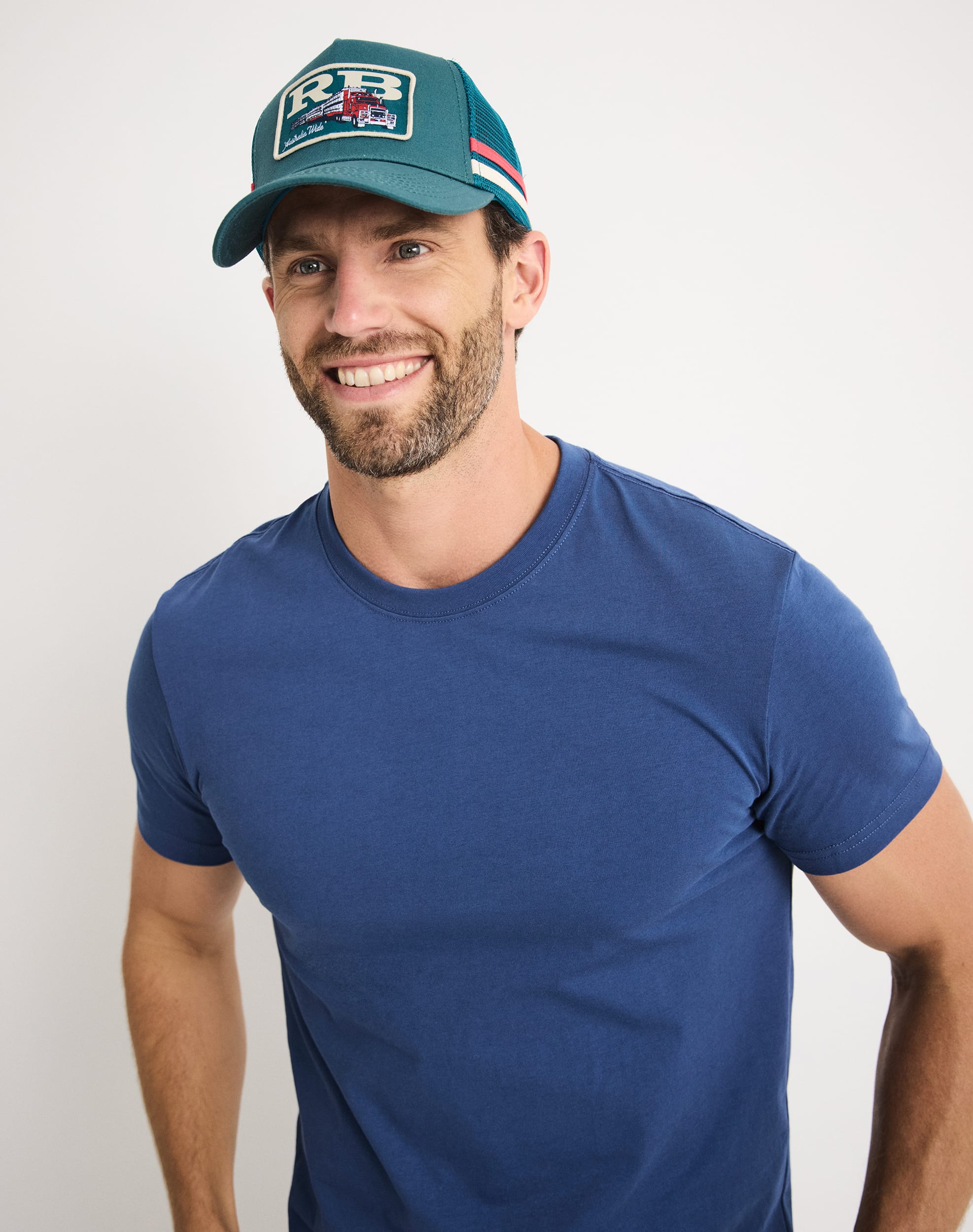 A proper trucker hat with twin side stripes and a snap adjustable closure — with a nod to those who keep the country moving.
