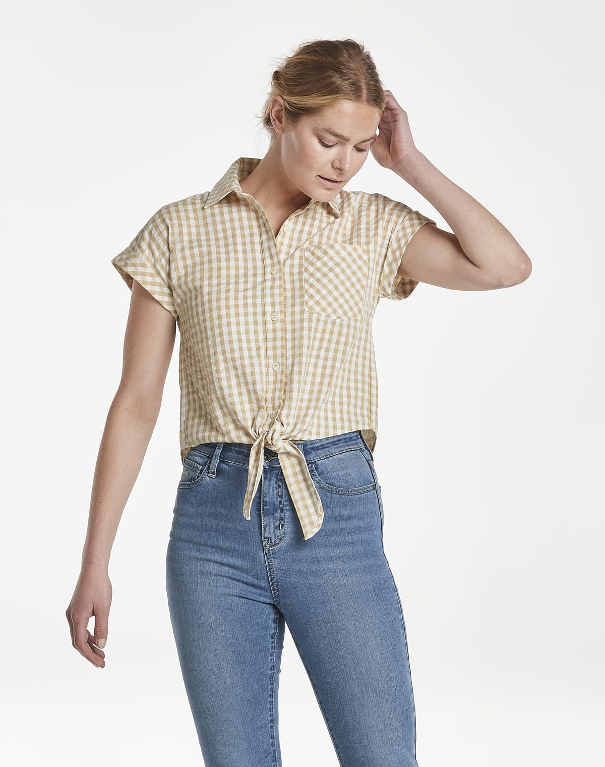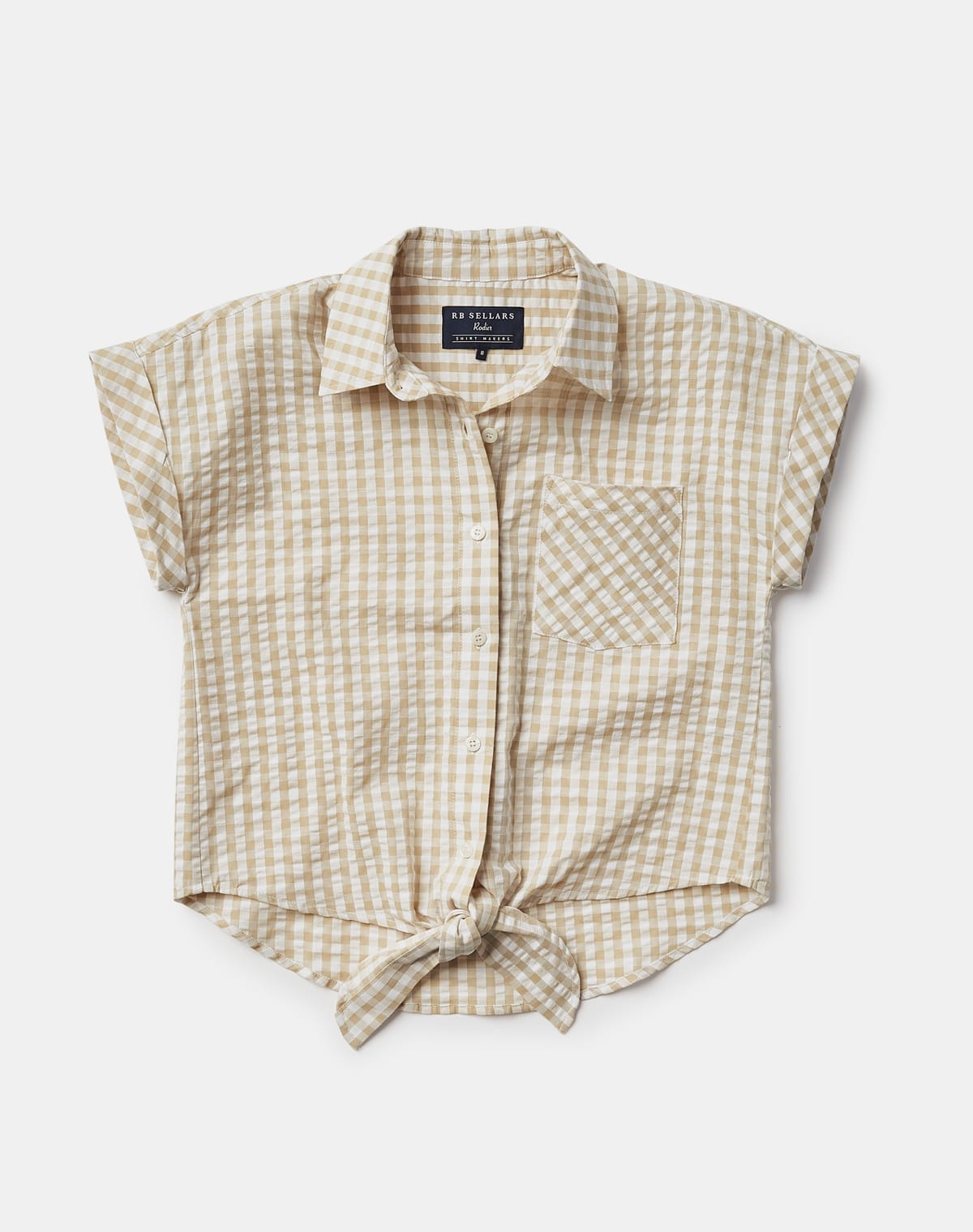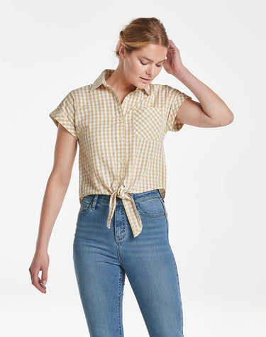 Elevate your shirt collection with this tie-front style. The classic seersucker design in sand gingham is a summer look you’ll love.
